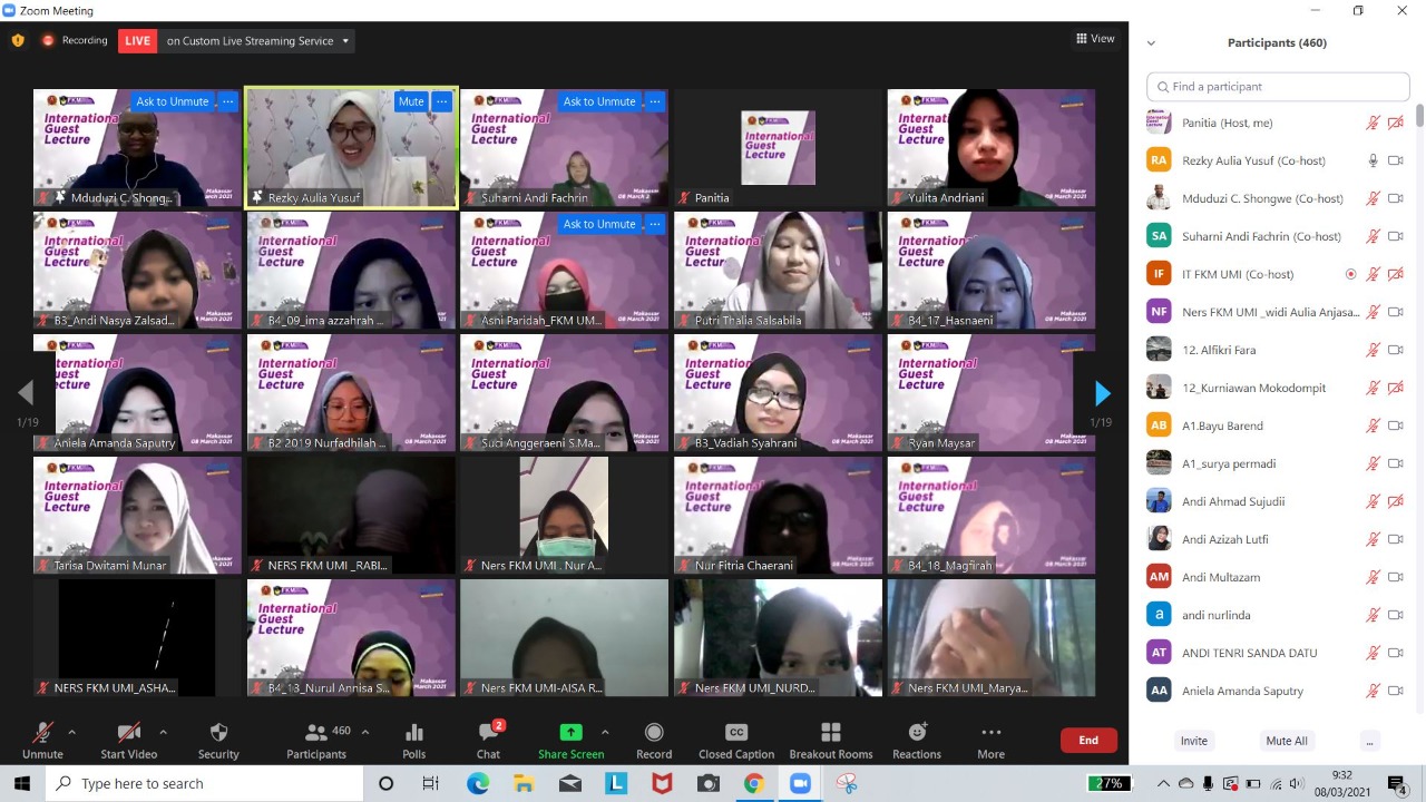 Bertindak selaku moderator pada kegiatan ini yaitu Rezky Aulia Yusuf, SKM, MS yang merupakan Dosen FKM UMI dan juga Alumni Master program di International Health Program, National Yang Ming Chiao Tung University dengan Narasumber utama adalah Mr. Mduduzi C Shongwe, PhD (c), MSc, BNSc, RN adalah Mahasiswa PhD di International Health Program, National Chiao Tung Univeristy, Taipei Taiwan dan juga dosen University of Eswatini.