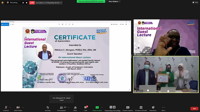 Dalam kegiatan international guest lecture ini, Mr. Mduduzi membagikan ilmu, pengalaman dan hasil studinya terkait ‘Dampak pandemic COVID-19 terhadap perilaku social dan kesehatan mental pada masyarakat umum dan petugas kesehatan di Eswatini, Afrika Selatan’.